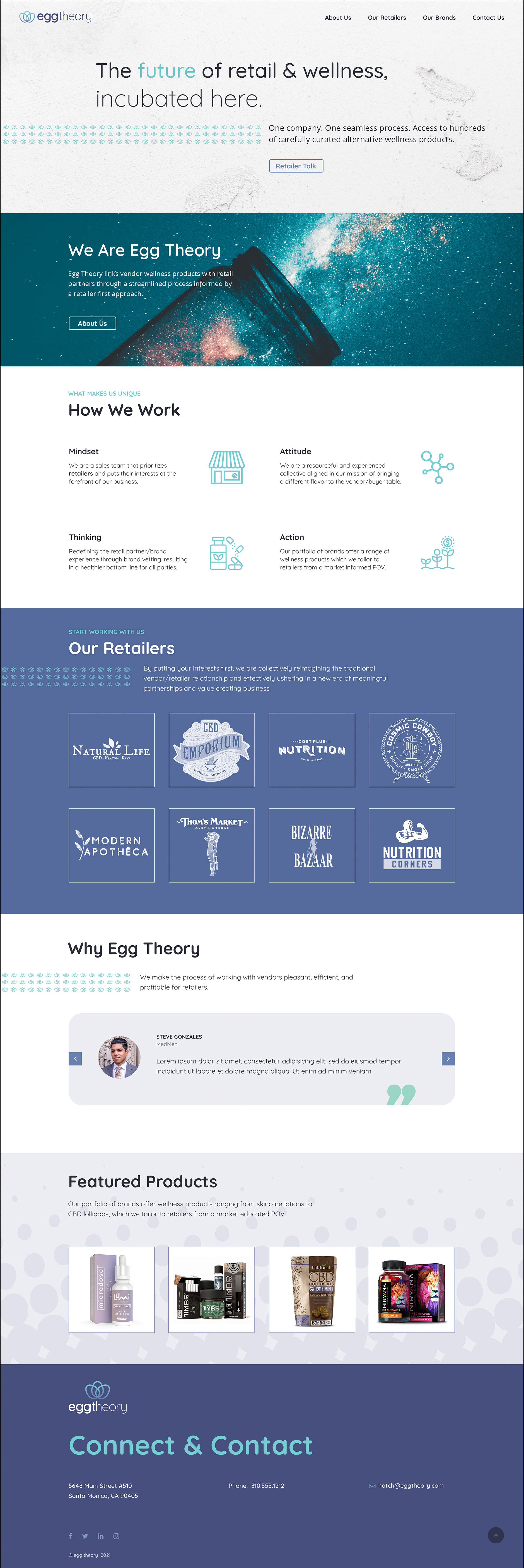 B2B Services Egg Theory Branding and identity design for a cannabis company centered around connecting brands and retail. Designed responsive website and hired and directed development phase as well as copywriting & key messaging. Storytelling DESIGN Branding UI/UX Design Creative Direction Responsive Design Innovation STRATEGY Content Strategy Brand Strategy UX Strategy Experiences PRODUCTION Project Management Account Management Client Presentation